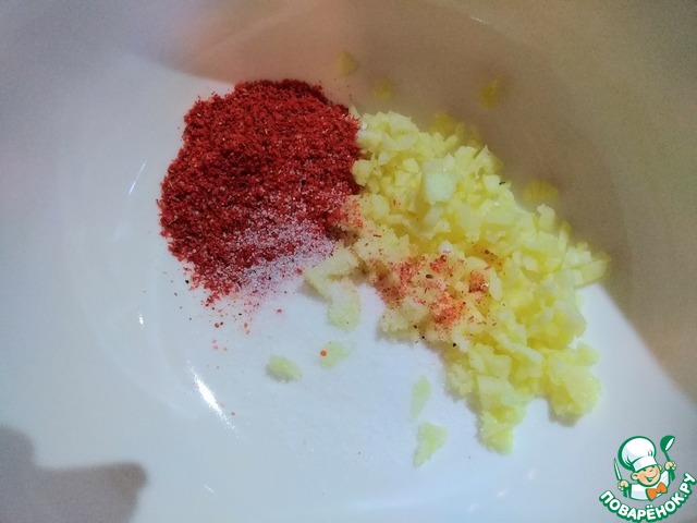 • Делаем соус. Перетираем мелко порубленный чеснок, аджику и соль (по вкусу). У меня сухая аджика.
