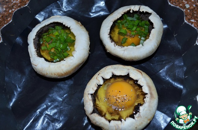 В каждую шляпку вылить яйцо, посолить.