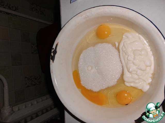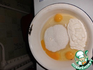 Затем в другой миске смешиваем майонез — 200 грамм яйцо — 3 штуки, сахар 1 стакан (граненый)