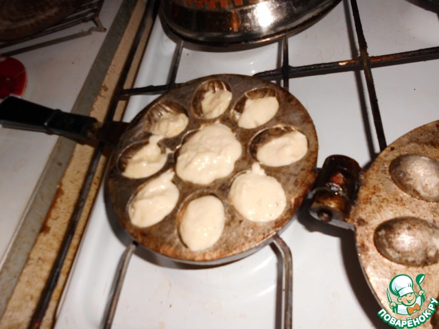 После смазываем пером выпуклые части орешницы и греем на газовой плите до 5 минут.