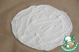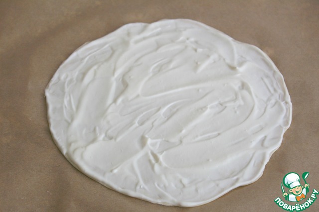 Тесто разделить на 3 части и раскатать одну часть на пергаменте в очень тонкий круг. -