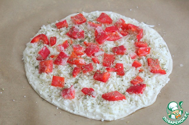 Раскатываем вторую часть теста на пергаменте. Ветчину нарезать мелким кубиком, сыр натереть на крупной терке и смешать со сметаной, мукой, растительным маслом. Нанести на тесто сплошным слоем -края промазать обязательно! Сверху разложить нарезанный лук. Посыпать по желанию жгучим перцем. Переложить на разогретый противень пергамент с пирогом, убрать в духовку на 8 минут - ориентируйтесь на свою духовку! -