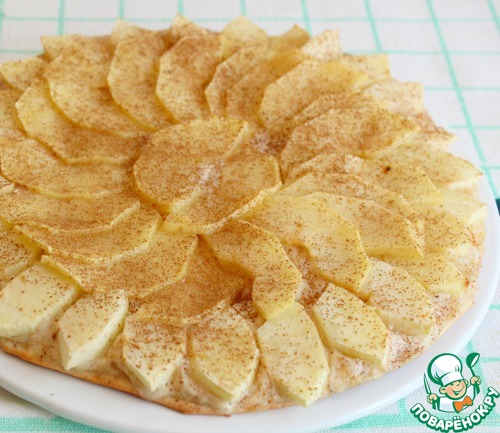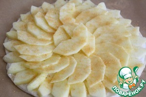 Раскатываем последнее тесто на пергаменте. Яблоки очистить от кожуры и семенных коробочек, порезать тонкими слайсами (я порезала толстовато). Смешать сметану, муку, корицу и ванилин, нанести на тесто, сверху разложить плотно яблоки, посыпать сахаром. Переложить на разогретый противень пергамент с пирогом, убрать в духовку на 10 минут - ориентируйтесь на свою духовку! -