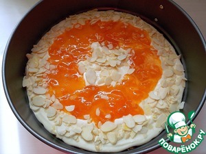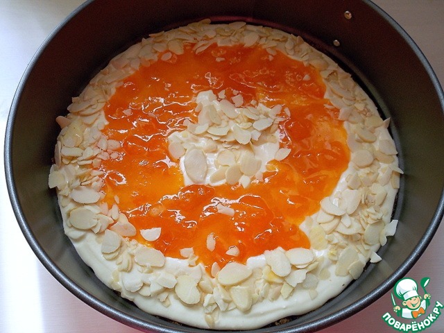 Залейте все оставшейся массой, посыпьте миндалем и украсьте абрикосами. Поставьте в холодильник на несколько часов до застывания.