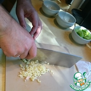 Мелко мелко нарезаем имбирь и чеснок.