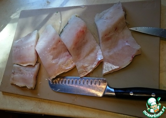 Зачищаем филе от реберных костей, удаляем маленькие, если обнаружим и нарезаем на порционные куски. Вот здесь понятно почему лучше брать судака большого веса.