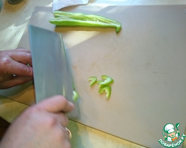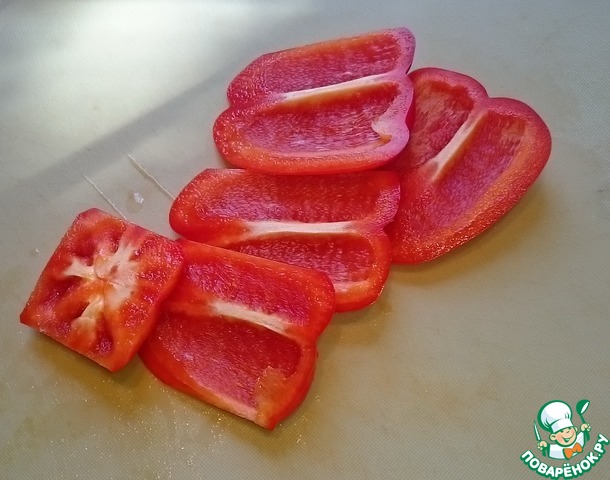 Болгарский перец зачищаем от семечек и белых перегородок. Нарезаем на небольшие, не слишком длинные полоски.