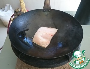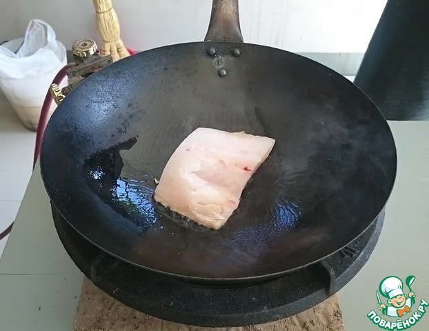 Хорошо разогреваем вок, наливаем немного растительного масла, и кладем кусок судака шкуркой вниз.