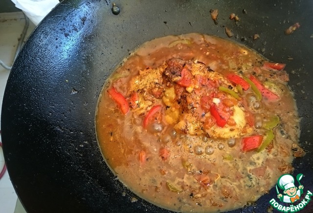Немного обжарили перцы - добавляем помидоры. Повторюсь еще раз - все овощи и чеснок мы подготовили на несколько порций рыбы. Все сразу класть не нужно.