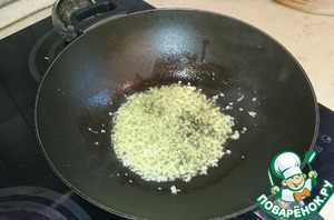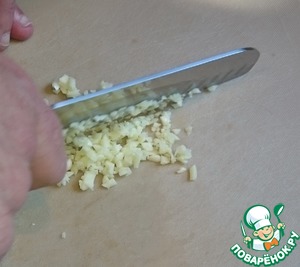 Разогреваем сковороду, наливаем немного подсолнечного масла и добавляем чайную ложку сливочного. Обжариваем чеснок, до прозрачности, не пережарьте.