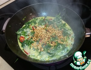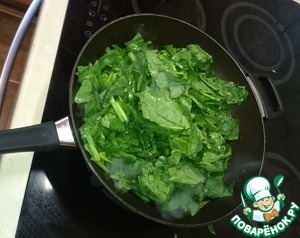 Добавляем шпинат и черемшу. Перемешиваем и тушим минут 5.