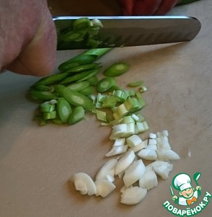 Добавляем нарезанные побеги чеснока. Еще немного обжариваем.