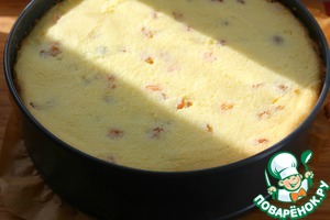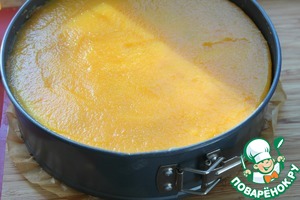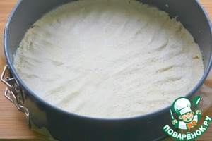 • Дно разъемной формы ( в рецепте рекомендуется на 26, но я брала на 24) выложить пергаментом и распределить по нему мокрыми руками равномерно тесто. Поставить в разогретую духовку на 180 градусов на 15 минут.
