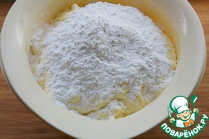 • Добавить муку с разрыхлителем и хорошо перемешать - я делала миксером. Тесто похоже на кексовое.