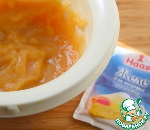 Я бы взяла обычный желатин - грамм 15, распустила бы в яблочном соке (70-100 мл) и далее, как обычно - соединила бы с яблочным пюре и залила пирог