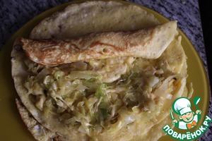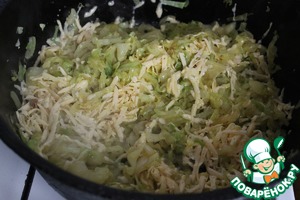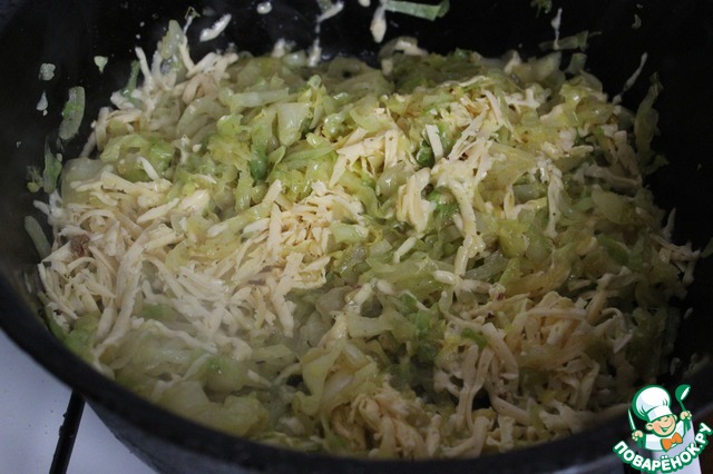 Капусту, нарезанную тонкой соломкой, репчатый лук, нарезанный полукольцами, и сливочное масло выложить на раскаленную сковороду, смазанную растительным маслом. Обжарить до мягкости. На мой взгляд, капуста в этом рецепте вкуснее мягонькая. Приправить хмели-сунели и солью. Когда капуста готова, всыпать тертый сыр, закрыть крышку и выключить огонь. Начинка для рулетов готова. Для любителей мясного можете добавить вареную колбасу, порезанную мелким кубиком, или вареную курицу, разобранную на волокна, в начинку до того, как забросили сыр. Но, честное слово, вкусно и без них.