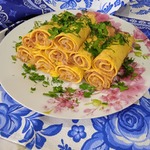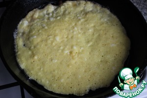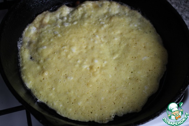 Смазываем сковородку растительным маслом и на средней конфорке (огонь меньше среднего) выпекаем тоненькие омлетные блинчики под крышкой. У меня их получилось 7 штук. Количество блинчиков зависит от размера сковородки. Как верх схватится, блинчик готов, снимаем его со сковородки и заливаем новый. Они прекрасно снимаются, не рвутся и очень тоненькие.