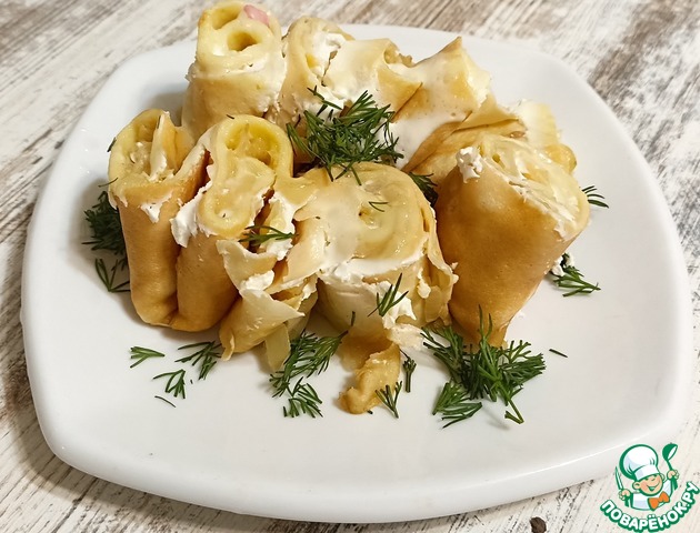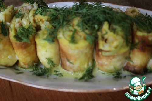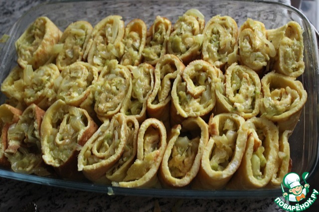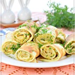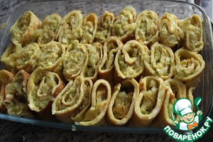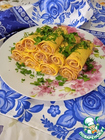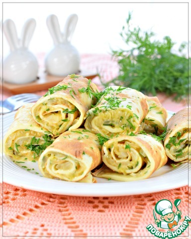 На не поджаренную сторону каждого блинчика выкладываем 1-2 столовых ложки с верхом начинки (количество зависит от размеров блинчика) и скатываем блинчик рулетом.