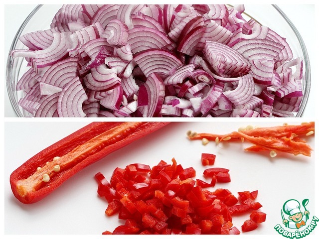 Лук очистить и порезать четверть кольцами не очень тонко. Перец чили почистить от семян и внутренностей и нарезать мелко.