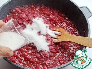 Обжаривать на достаточно сильном огне в течение 10 минут постоянно помешивая, пока лук немного не упарится. Не допускайте пригорания, лук должен осесть, но не в коем случае не зажариться. Далее добавьте 150 мл красного вина, 100 грамм сахара и щепотку молотой гвоздики, доведите массу до кипения, уменьшите огонь до тихого, накройте сотейник крышкой и тушите лук 15 минут периодически перемешивая. Через 15 минут снимите крышку и продолжайте тушить лук до выпаривания жидкости еще минут 20-25.
