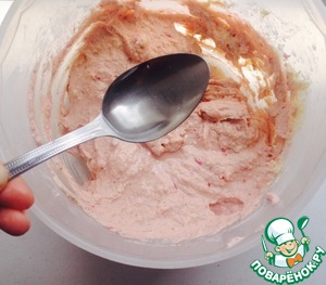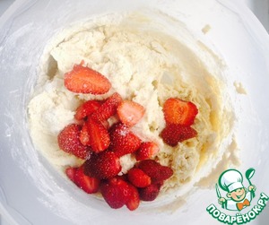 Нарежьте клубнику произвольными кусочками и бросьте к остальному тесту. Опять таки при помощи блендера добейтесь однородного состояния. Вообще клубнику можно и кусочками оставить - все зависит от Ваших пожеланий, строгих правил тут нет.