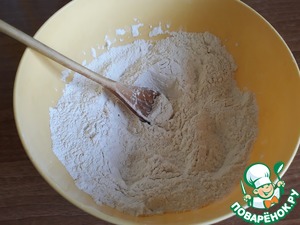 В миску просеять 2,5 ст. муки, добавить сахар, сухие дрожжи и соль. Все сухие ингредиенты смешать.