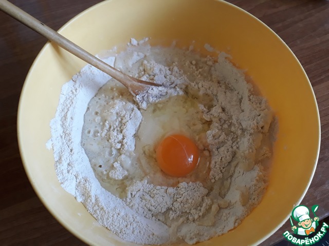 В сухие ингредиенты влить жидкие и добавить яйцо, перемешать. И постепенно вмешивать остатки муки (1стакан) до мягкого теста. После припылить стол мукой, выложить из миски тесто и месить минут 6 до гладкости.