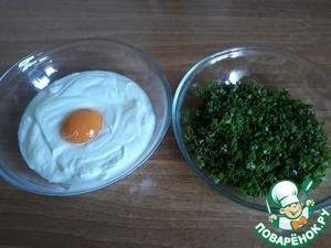 В это время подготовим начинку. Перья зелёного лука промыть, просушить и мелко нарезать. Сметану, желток и лук смешать.
