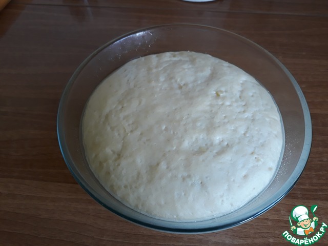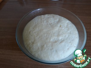 Чистую миску смазать растительным маслом и поместить в неё наше тесто, накрыть и оставить подходить примерно вдвое на 1 час.
