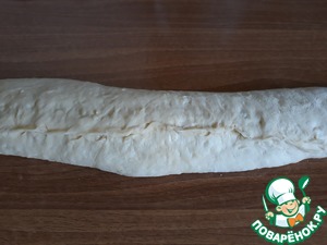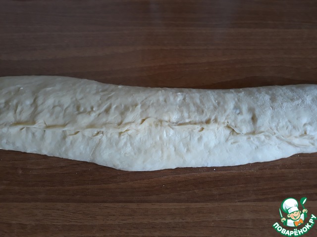 Тесто подошло. Разделочную поверхность припылить мукой, выдожить тесто и раскатать податливое тесто в прямоугольник размером 44 на 28 см.
