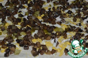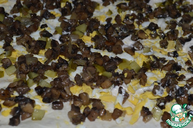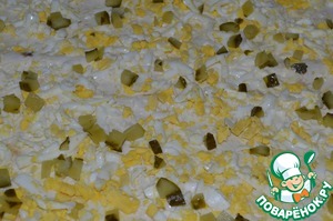 Распределить по поверхности тертые яйца и огурцы, нарезанные кубиком. -