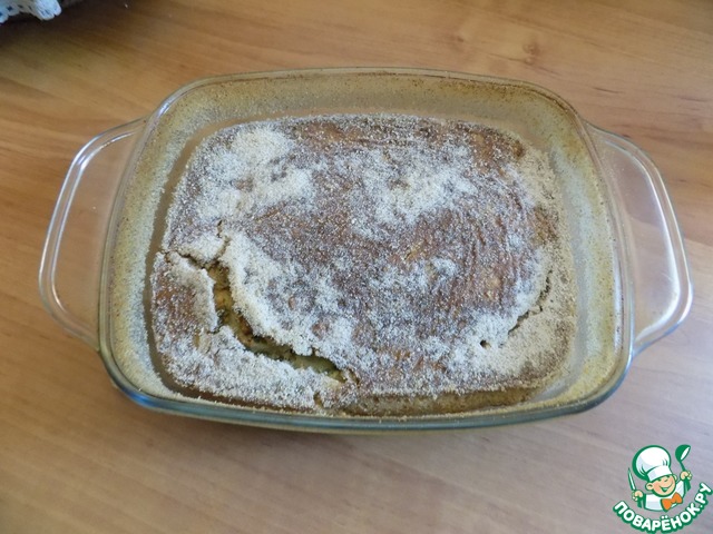 Выложила равномерно тесто по всей форме, присыпала немного верх пирога сухарями и поставила в духовку 180*С и время 40 минут.