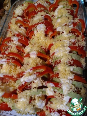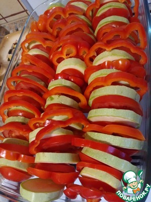 Уложить в форму для запекания, чередуя - кабачок, помидор, перец. -
