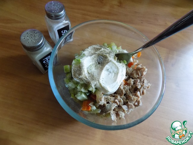 Заправляем, солим и перчим. Перемешиваем.