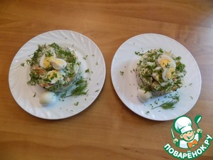 Выкладываем яйца перепелиные поверх салата и присыпаем рубленным укропом.