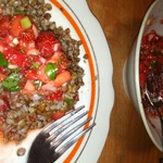 Заправить оливковым маслом, выдавить сок лимона, посолить, поперчить, добавить совсем немного сахара. Горошины кориандра раздавить пальцами или растереть в ступке и добавить ко всем ингридиентам. Салат перемешать, убрать в холодильник на некоторое время (мне хватило 5-10 минут)
