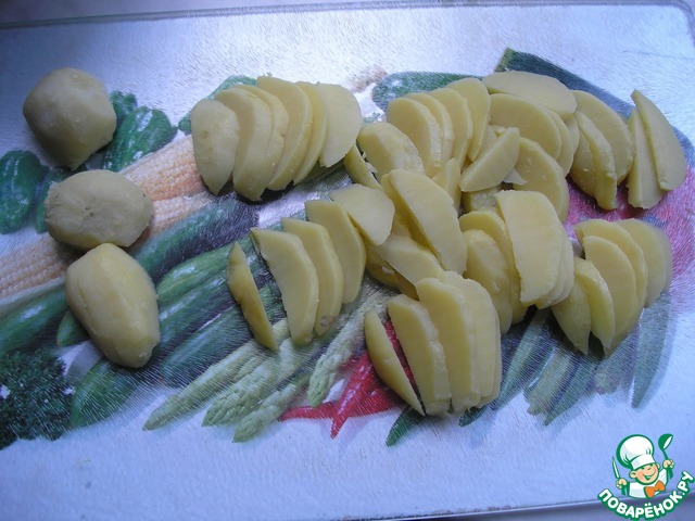 Молодой (в сезон) картофель отварить, нарезать тонкими полукольцами или соломкой.