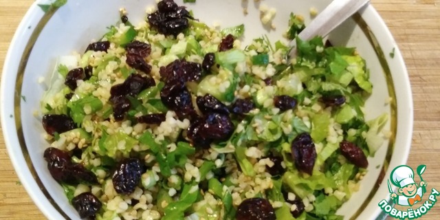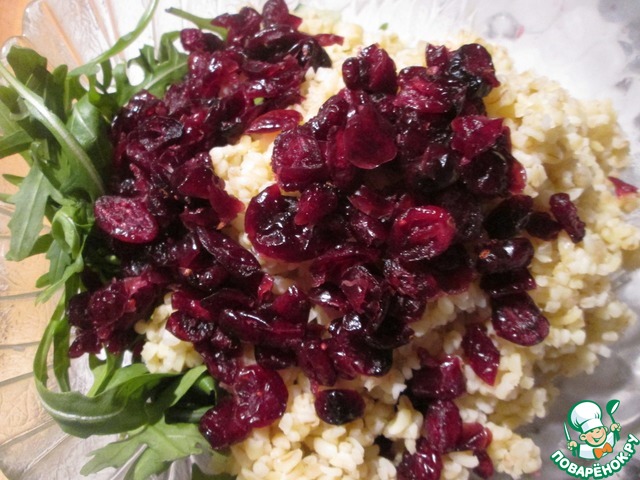 Далее добавляем вяленую клюкву и отваренный булгур.