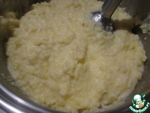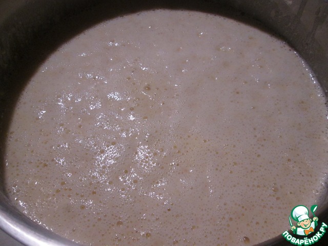 Смешайте муку, дрожжи, оставшуюся соль и соду. Яйца взбейте с сахаром в легкую пену. Соедините мучную и яичную смесь. взбейте еще раз, влейте оставшиеся сливки. В полученную смесь добавьте немного остывшую пшенную кашу. Если тесто получилось слишком густым, можно добавить немного теплой воды. накройте емкость пищевой пленкой и поставьте в теплое место на 1,5-2 часа.