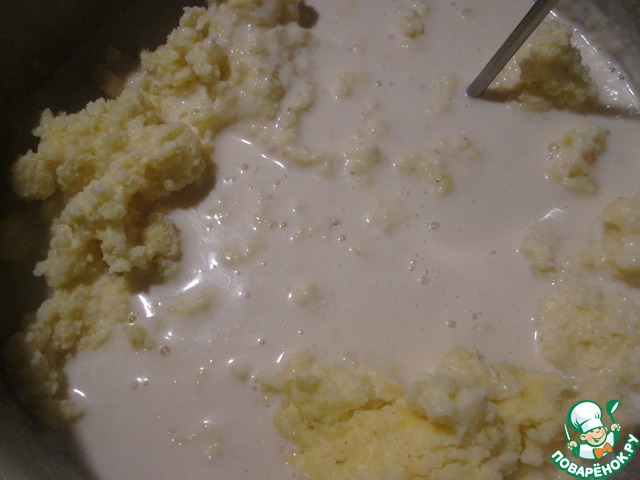 Пшено тщательнейшим образом промываем попеременно в горячей и холодной проточной воде до тех пор, пока стекающая вода не будет абсолютно прозрачной. Если этого не сделать, готовое пшено будет горчить. промытое пшено выкладываем в кастрюлю, добавляем 0,5 ч. л. соли, заливаем тремя стаканами кипятка, доводим до кипения и готовим до разваривания, минут 25. В готовую кашу вливаем 100мл. сливок и перемешиваем. Если каша не достаточно разварилась, пробейте ее блендером.
