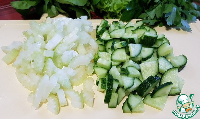 Затем нарезаем шпинат и петрушку, добавляем смесь перцев, сок лайма или лимона, соевый соус и масло, солим по вкусу.