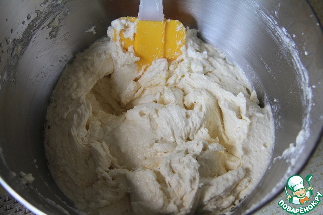 Добавить просеянную муку с разрыхлителем. Вымешать до однородного состояния.