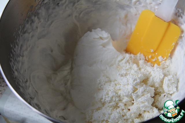 Готовим сливочно-творожный крем: перетереть творог (можно взять уже мягкий творог). Сливки взбить с сахарной пудрой. Аккуратно соединить до однородного состояния творог и сливки.