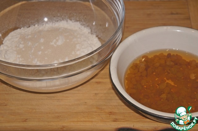 Замочить изюм в роме. Растворить дрожжи в теплой воде.
