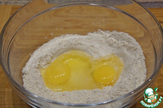 Насыпать муку горкой на стол или разделочную доску и сделать углубление в центре. Положить в него сахар, соль, два яйца и разведенные дрожжи, перемешивать деревянной лопаткой, пока смесь не станет упругой.