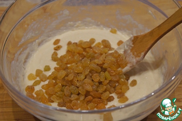 Слить с изюма оставшийся ром; добавить набухший изюм в тесто и снова хорошо его вымесить. Накрыть тесто чистой полотняной салфеткой и оставить на час при комнатной температуре.