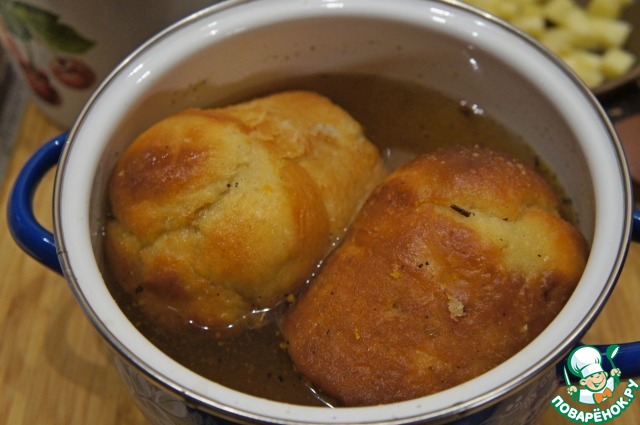 Погрузить ром-бабы в горячий сироп и вымачивать в нем до тех пор, пока пузырьки не перестанут появляться на поверхности жидкости.