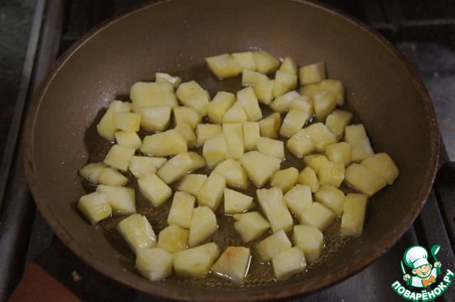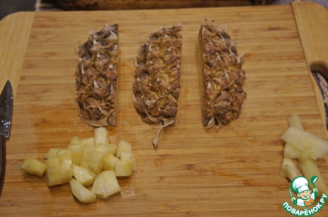 Тем временем подготовить карамелизированный ананас: очистить его, удалить жесткую серединку, мякоть нарезать на небольшие кубики.