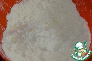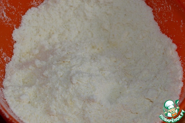 Муку смешать с сахарной пудрой и разрыхлителем.