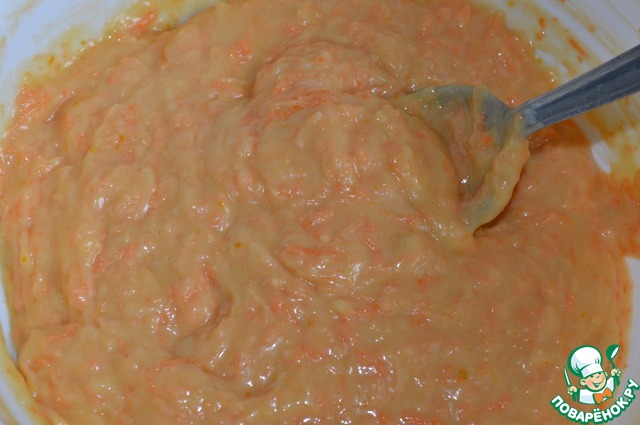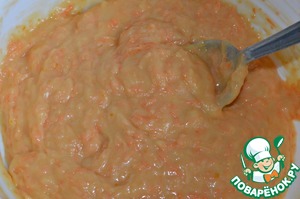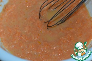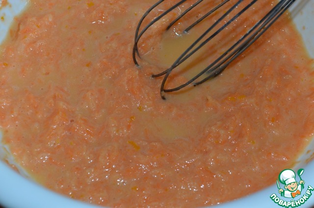 Морковь натереть на мелкой терке, смешать с оливковым маслом, молоком и яйцом.